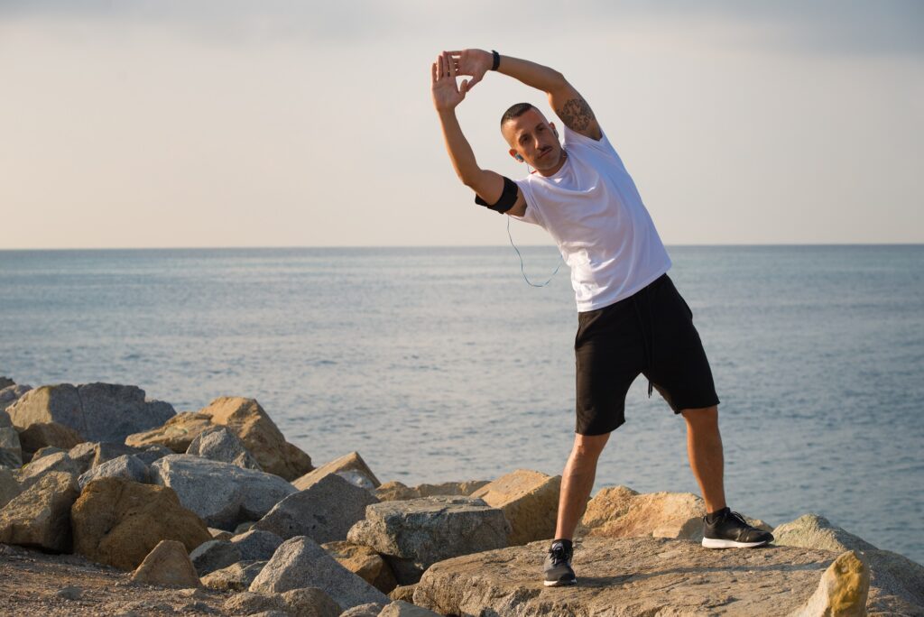 Serious handsome young sportsman listening to music via gadget while doing exercising on shore. Concentrated male athlete with raised arms bending aside. Sport as lifestyle concept